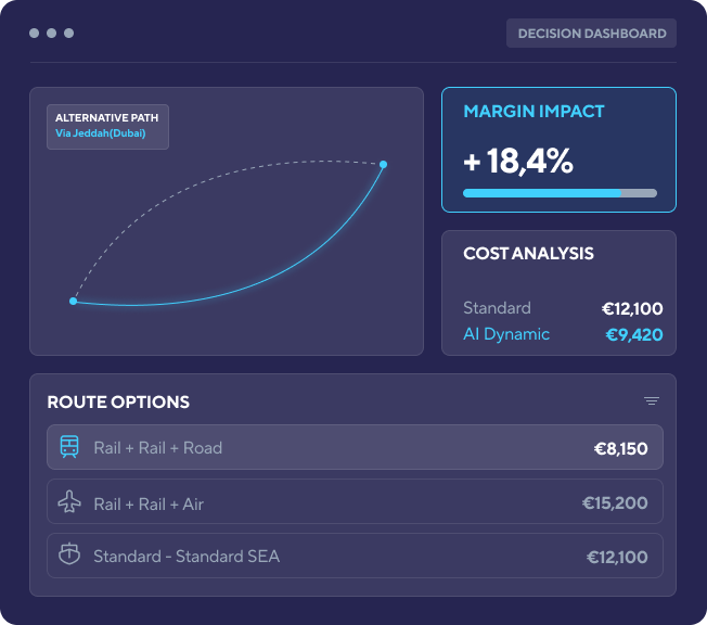 FreightGo connects global trade lanes, transport modes, and cost intelligence into one decision platform. Even before disruption occurs, the system identifies viable routing alternatives instantly.